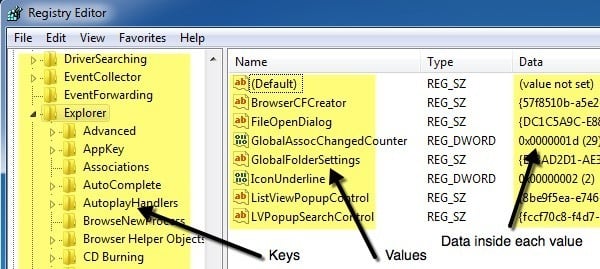 The registry is made up of millions of keys and values. You can think of keys as folders and values as the data stored inside the folders. In the registry editor, keys actually look like folders and values are what hold the actual settings. Each key in the registry can have more than one value, kind of like a folder can have more than one file stored inside.