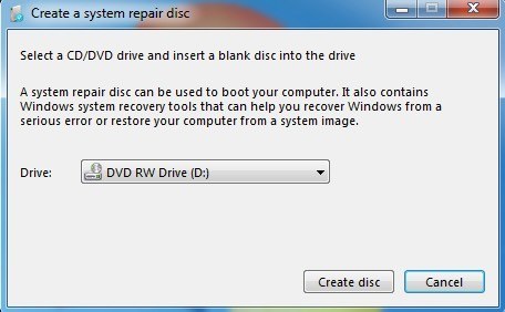 Pop in a CD or DVD and click the Create disc button. Once you have this disc, you can boot directly from it to get the system recovery options shown above. The only thing you need to ensure is that the boot order has the CD/DVD ROM drive listed first.