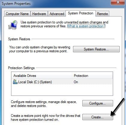 Click on Start and type in Create restore point and click on the first result. You’ll be bought straight to the System Protection tab in the System Properties dialog.