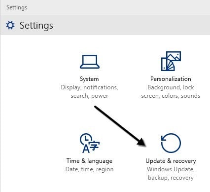Next, click on** Update and recovery** in the Settings dialog. As you can see, the Settings dialog in Windows 10 is completely different than the one in Windows 8.