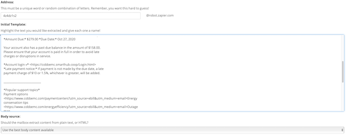 Go to https://parser.zapier.com and sign in. Once you’ve done this, select Create Mailbox. You will see an email address at the top of the screen that is basically gobbledygook, but it looks like this for a reason. Forward one of your bills to that address.