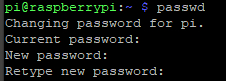 It will prompt you to enter your current password, so type that in and press Enter. Next, type your new password and hit Enter. Next, it will ask you to confirm your new password. Type it in again, press Enter, and you have successfully changed your Pi’s password.