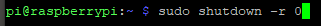 To restart your pi, use sudo shutdown -r. By default, your Pi will reboot in one minute. If you want it to reboot instantly, you can use sudo shutdown -r 0, where 0 stands for zero minutes or right now.