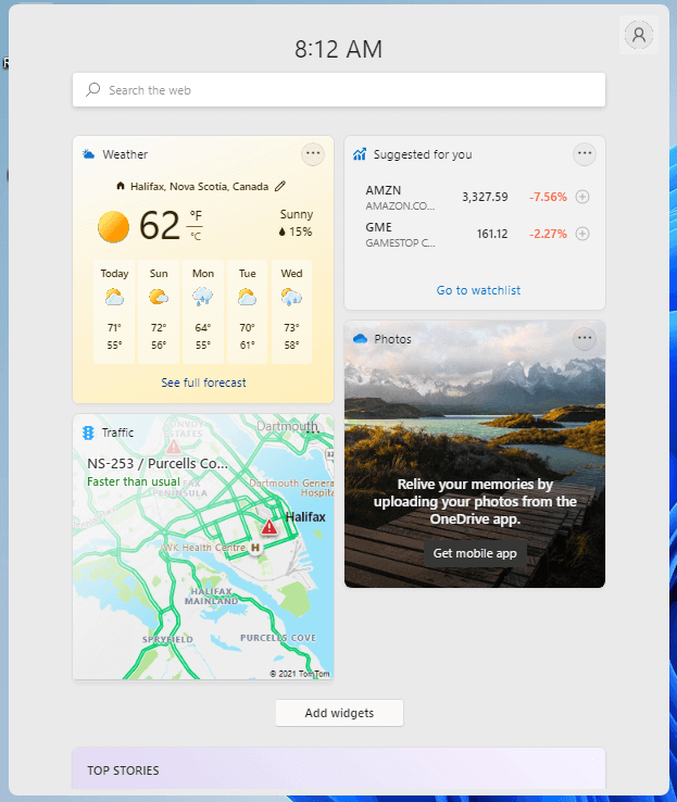 Windows Widgets are likely to be a big hit. They’re a bit like Live Tiles but also a bit like Windows Gadgets from Windows Vista and Windows 7. You might think of it as a dashboard that presents personalized information on things like your Microsoft To Do list, traffic, sports, weather, and financial news. Expect more information and widgets to become available.