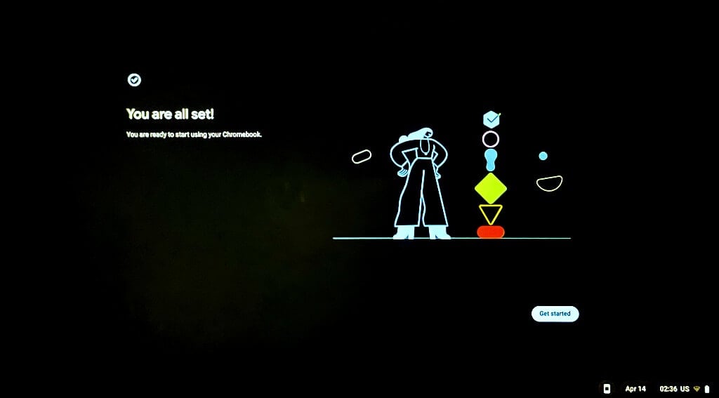 - Select Get started to set up your Chromebook.