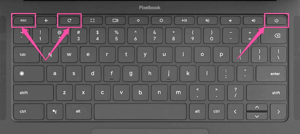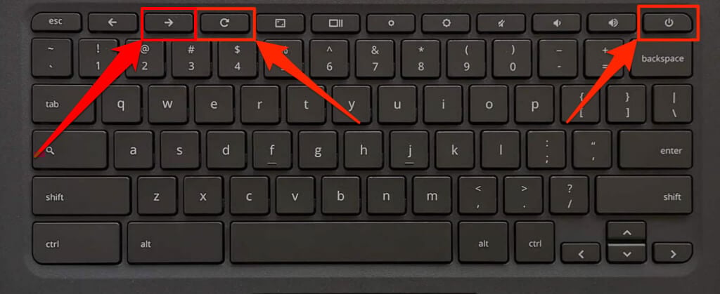 - Press and hold the Refresh + Esc keys, then press the Power button to put your Chromebook in recovery mode.