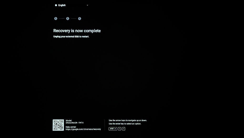 - Remove the USB recovery media when the “Recovery is now complete” success message appears on the screen. Your Chromebook should restart after unplugging the recovery media.