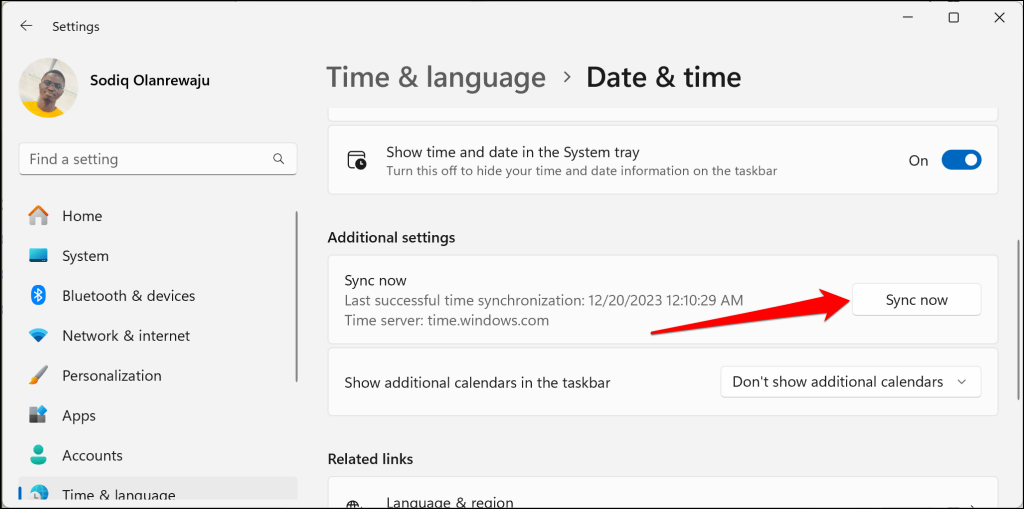 Next, select the Sync now button in the “Additional settings” section to sync your PC with the Windows time server.