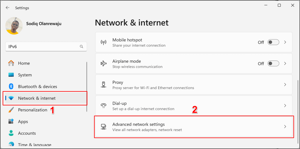 - * Go to Settings > Network & internet and select Advanced network settings.
