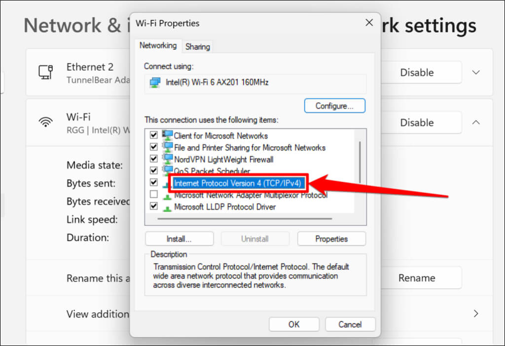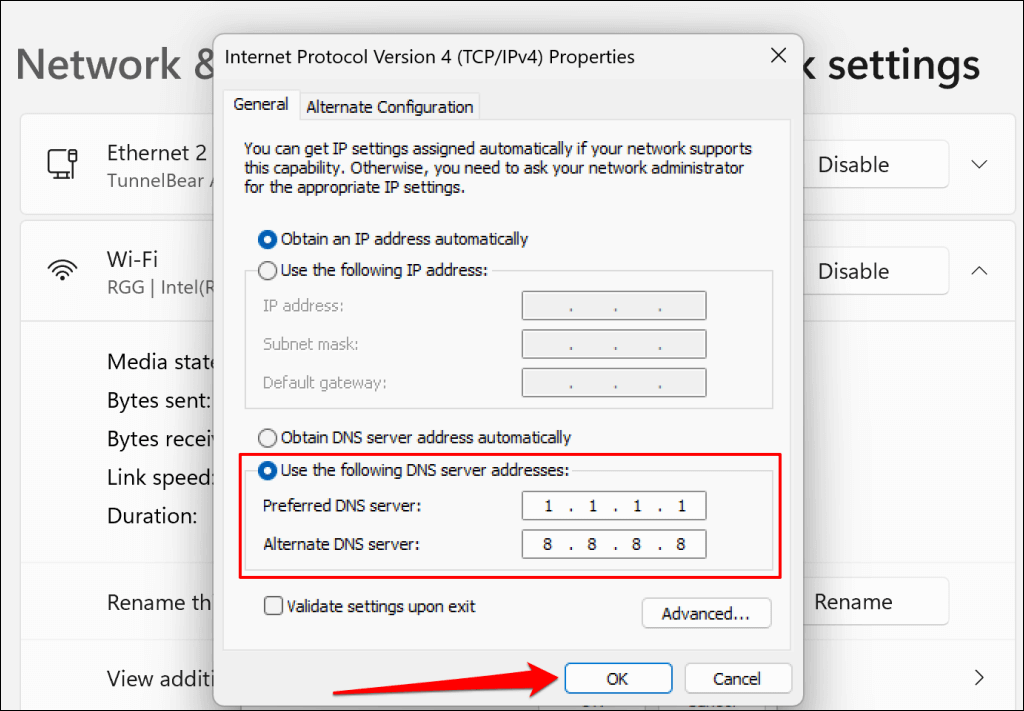 Reload the iCloud tab in your web browser and check if you can sign in. Change the DNS servers for the Internet Protocol Version 4 (IPv4) if the connection issue persists.