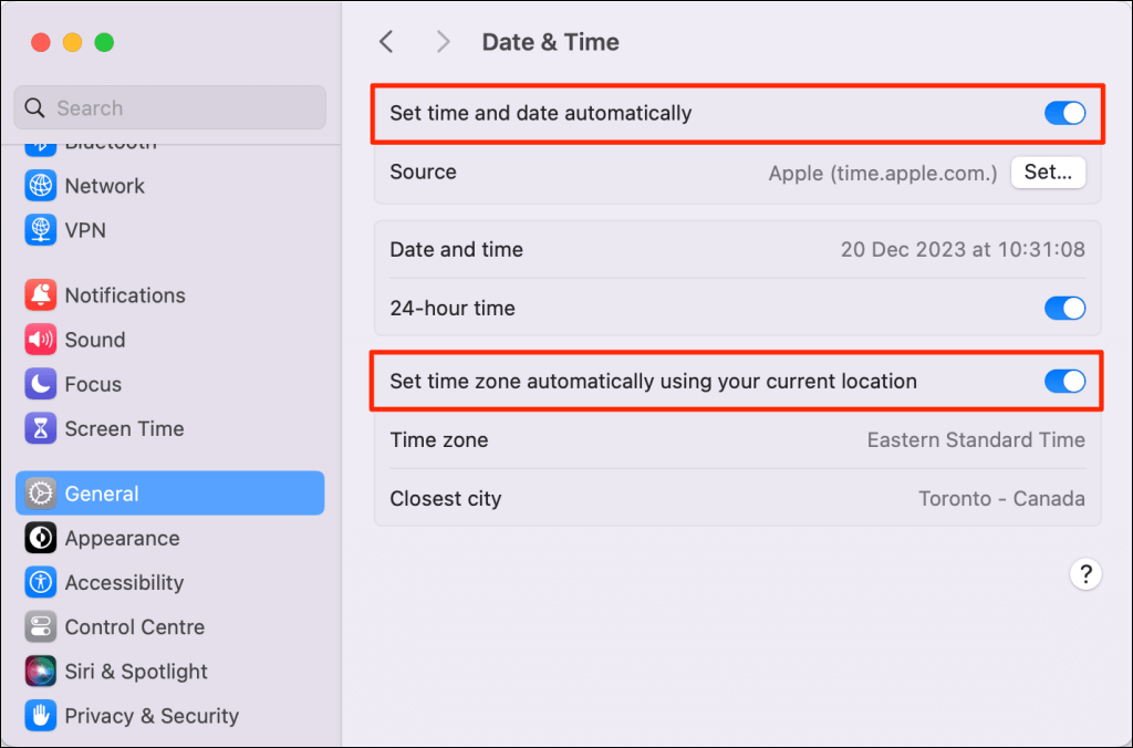 Go to System Settings > General and select Date & Time. Toggle on Set time and date automatically and Set time zone automatically using your current location.