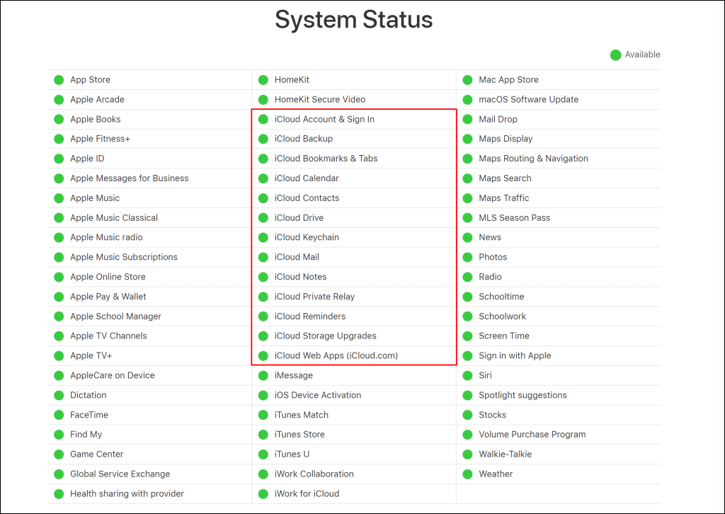 Server downtime can trigger the “Connection Error” when accessing iCloud on the web. Visit Apple’s System Status page and check the status of iCloud Account & Sign In and iCloud Web Apps (iCloud.com).