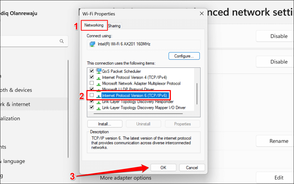 - Open the “Networking” tab, uncheck Internet Protocol Version 6 (TCP/IPv6), and select OK.