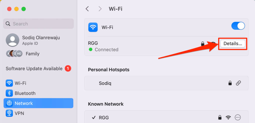 - Go to System Settings > Network > Wi-Fi (or Ethernet) and select the Details button next to the network you’re currently using.