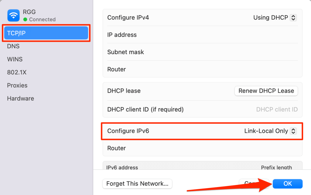 - Select TCP/IP on the sidebar, set “Configure IPv6” to Link-Local Only, and select OK.