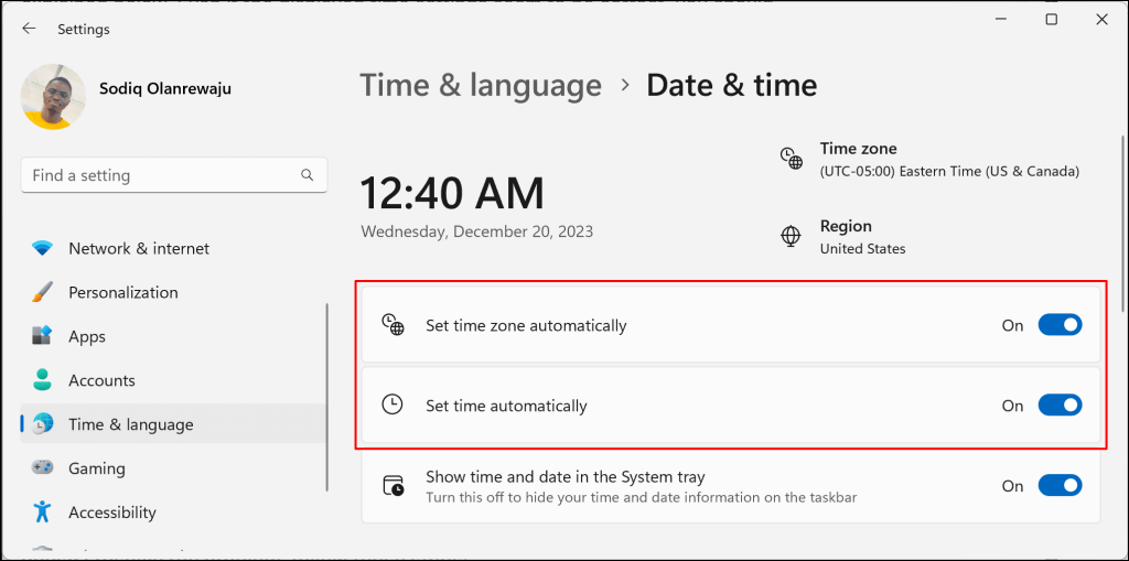 Go to Settings > Time & language > Date & time and toggle on Set time zone automatically and Set time automatically.