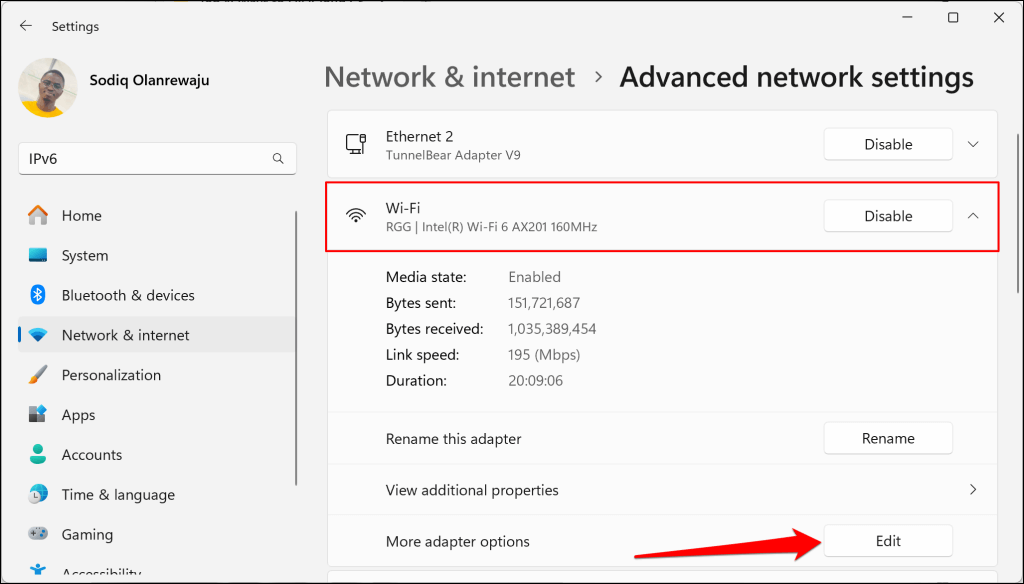 - Select Wi-Fi (or Ethernet if you’re using an Ethernet connection) and select the Edit button next to “More adapter options.”