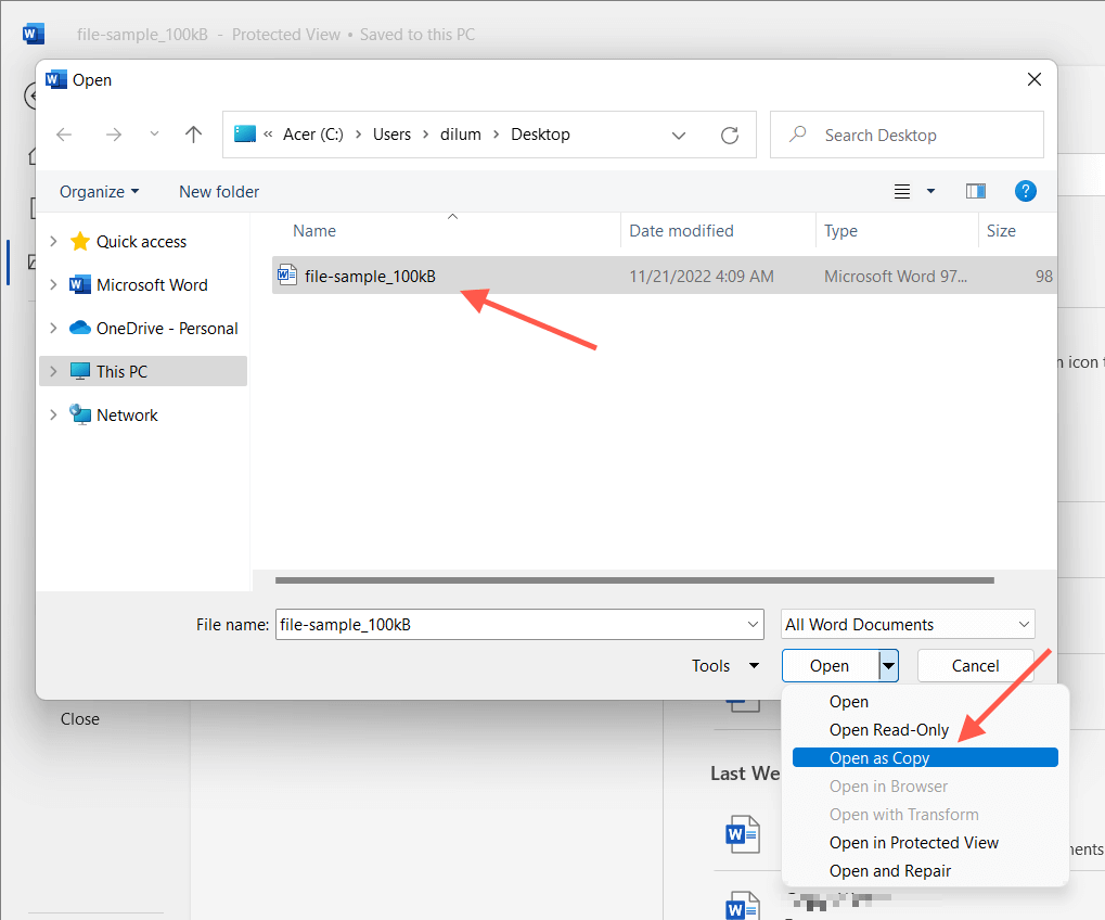 - Select the Word file you want to open. * Select the Down arrow next to the Open button and choose Open as Copy.