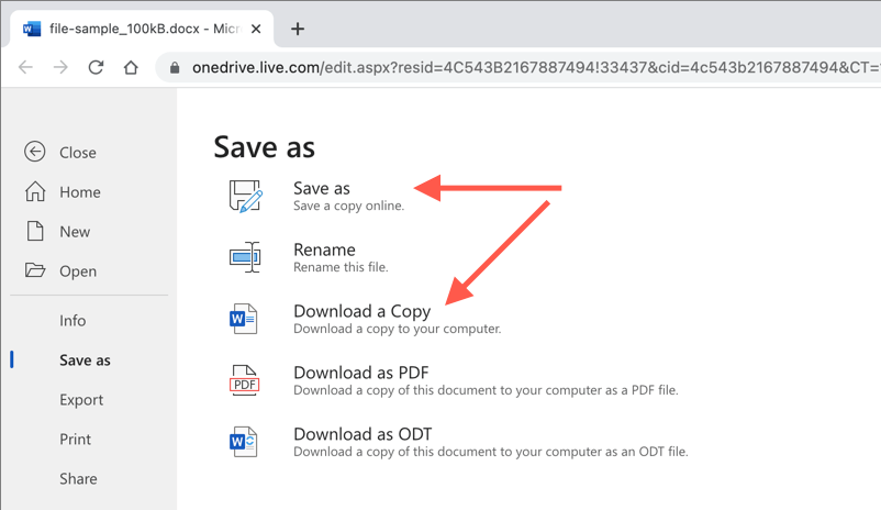 In Word Online, you can save duplicate copies of files to other locations of OneDrive, or download files directly to your PC or Mac.