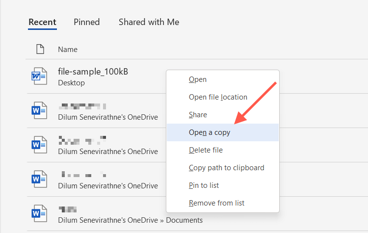 - Hover the mouse cursor over the file on the Recent list. * Right-click and select Open as copy.