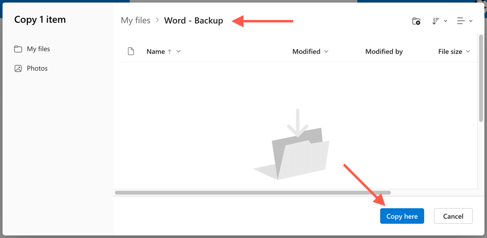 - Pick the destination folder in OneDrive and select Copy here.