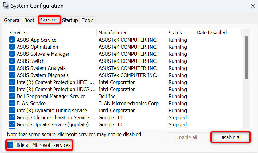 - Open the Services tab, enable Hide all Microsoft services, and choose Disable all.