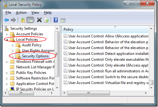 In the left hand pane of the Local Security Policy window, click on the Local Policies folder and then the Security Options folder. Now, you should see numerous options available to you in the right hand pane.