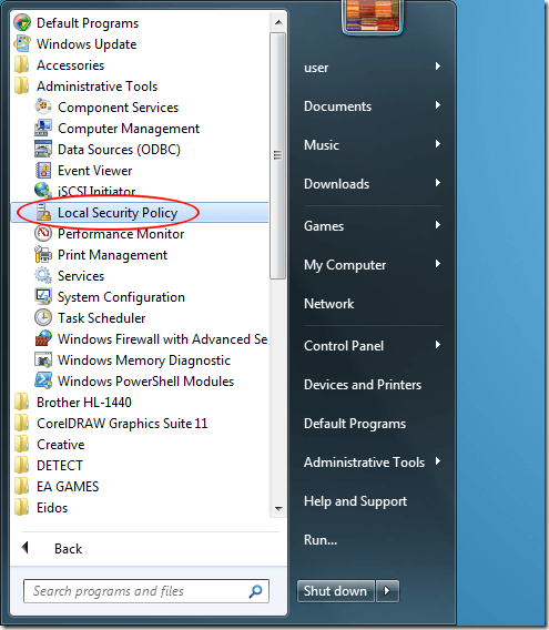 Log in to Windows using an account that has administrative privileges. Then, click on Start>All Programs>Administrative Tools>Local Security Policy.