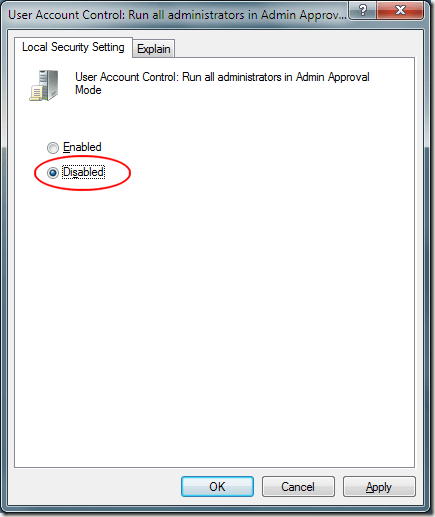 In the right hand pane, locate an option titled User Account Control: Run All Administrators in Admin Approval Mode.
