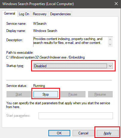In the new tab that opens, click Stop to stop the Windows Search indexing service, and then click the** Startup type** dropdown box. In the list that appears, select Disabled. After, click Apply.