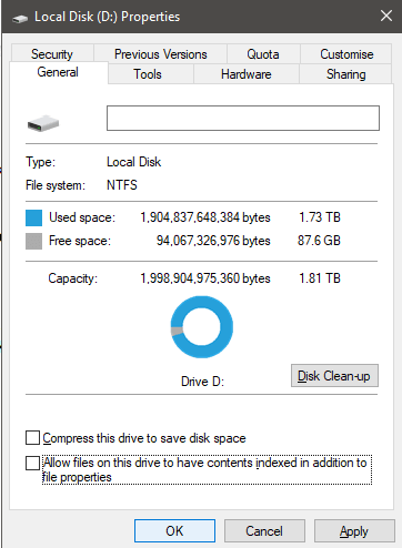 On the** General **tab, click to uncheck Allow files on this drive to have contents indexed in addition to file properties at the bottom. After, click Apply.