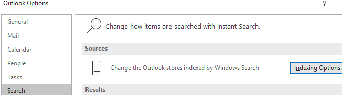 In the Options page, click the Search tab on the left and then click on the blue highlighted Indexing Options… button. Next, you’ll see a similar menu to before, but you’ll now see Microsoft Outlook in the list.