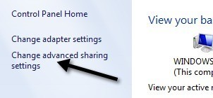 The second thing you can try is to turn off media streaming. Media Streaming is a feature that lets you turn your computer into a kind of local media server whereby people can access pictures, videos, music over the network. To turn off media streaming, go to Control Panel again, click on Network and Sharing Center (or Network & Internet, if not using icons). Then click on Change Advanced Sharing Settings in the left hand column.
