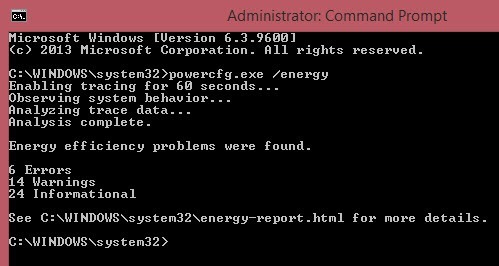 As you can see, I had 6 errors and 14 warnings. The errors is really the only section you have to look at. In order to view the report, you have to go to C:\Windows\System32 and open the energy-report.html file in your browser. However, for some odd reason, the file would not load in any browser when I tried to open it from that directory, so I just copied the report to my desktop and then opened it and it worked fine.