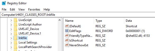 Open the registry editor by going to Start and typing in regedit. Then navigate to the following key: HKEY_CLASSES_ROOT\lnkfile