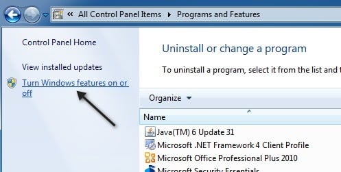 Next, click on the **Turn Windows Features On and Off **link located in the left-hand pane.