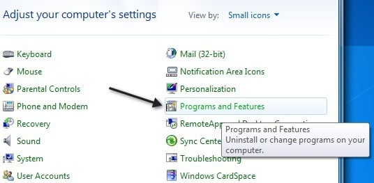 Depending on your version of Windows 7, you can have IE 8, IE 9, IE 10 or IE 11 installed by default! No matter which version of IE is installed, though, you can uninstall and reinstall IE by simply going to the Control Panel. In the Control Panel, just click on Programs and Features. If you don’t see the list view like below, change the** View by** to Small or Large icons.