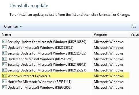 There’s also a second way to reinstall Internet Explorer in Windows 7. Instead of clicking on Turn Windows Features On and Off in the Control Panel screenshot above, click on View Installed Updates.