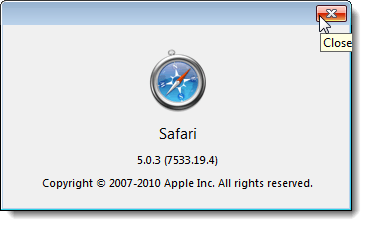 The currently installed version of Safari displays on the About dialog box. To close the About dialog box, click the X button in the upper, right corner.