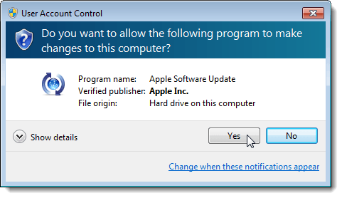 When you click OK on the Apple Software Update Preferences dialog box, the User Account Control dialog box may display again, depending on your settings (see the note earlier in this post). Click Yes to return to the Apple Software Update dialog box.