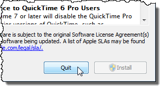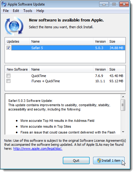 To close the Apple Software Update dialog box, click the Quit button at the bottom. You may also select Quit from the File menu.