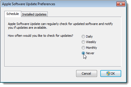 The Apple Software Update Preferences dialog box displays with the Schedule tab active. Select the radio button that corresponds with how often you want the program to check for updates.