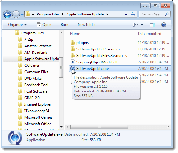 There is no shortcut created for the Apple Software Update program, so navigate to the following directory containing the .exe file in Windows Explorer:
