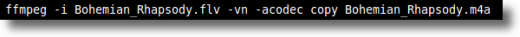 ffmpeg – launches FFmpeg -i Bohemian_Rhapsody.flv – provides FFmpeg with the name of the input file -vn – tells FFmpeg to ignore the video track -acodec copy – copies the audio track (instead of encoding to another format) Bohemian_Rhapsody.m4a – name of the output file