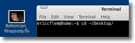 The first thing we need to do is find out exactly what codecs are used in our FLV file. To do that, open the Terminal (if it isn’t still open), and change to the directory where the FLV file is located. In our example, the file is called Bohemian_Rhapsody.flv and it is located on the Desktop. So the command to type would be: