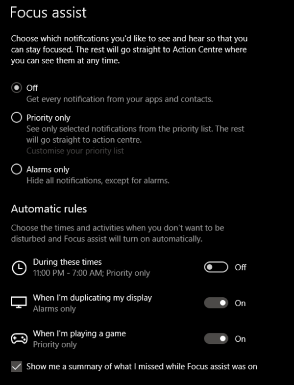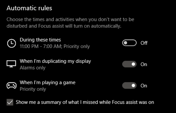 If you don’t want to be disturbed while playing a video game or during a presentation at work, Windows already has you covered. Focus Assist will automatically activate itself.