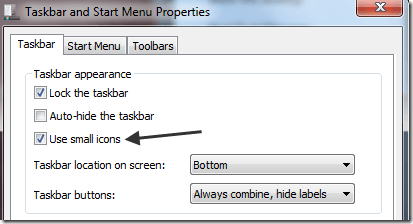On the Taskbar tab, check the Use small icons box. Then click the OK button.