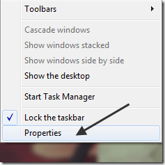The options are slightly different between Windows 7 and Windows 10. First, here’s how to do it in Windows 7: right-click on an empty space in the taskbar and click on Properties.