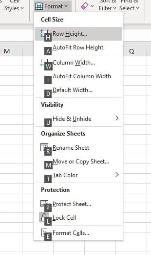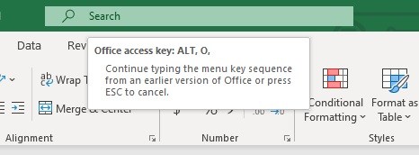 - To manually adjust column width, **press ALT **to put Excel into shortcut mode. Then **hit the O key **to access Excel 365’s legacy menu options.