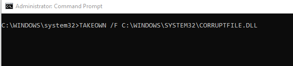 Remember to replacewith the path of the corrupt file. This command will allow you to take ownership of the infected file. CMD will inform you if the takeover is a success.